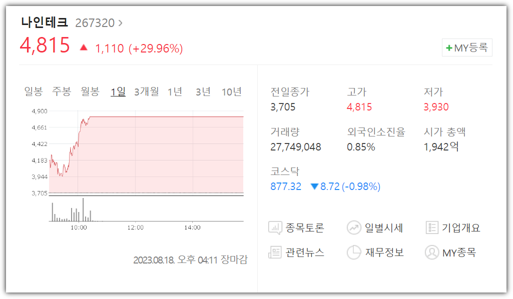 맥신 등 나노신소재 연구팀과 이차전지용 핵심소재 개발 MOU 체결 사실이이 있습니다. 지난 6월 '유무기 하이브리드 재료의 합성과 그래핀, 맥신 등 나노 신소재에 관한 연구'를 진행 중인 한국교통대학교의 나노화학소재공학과 인인식 교수팀과 이차전지용 핵심소재 개발을 위한 업무협약을 체결했다는 소식입니다. 나인테크는 2차전지 부품장비 전문기업으로 과거 LG디스플레이가 주력 고객사였지만 최근에는 중국 디스플레이 업체를 중심으로 매출이 발생하고 있다는 설명입니다. 디스플레이 장비 매출액은 지난 2021년 196억, 2022년 239억으로 꾸준히 성장중이며 올해 디스플레이 장비 부문 매출에서도 유사한 수준으로 진행할 것으로 보고 있습니다.