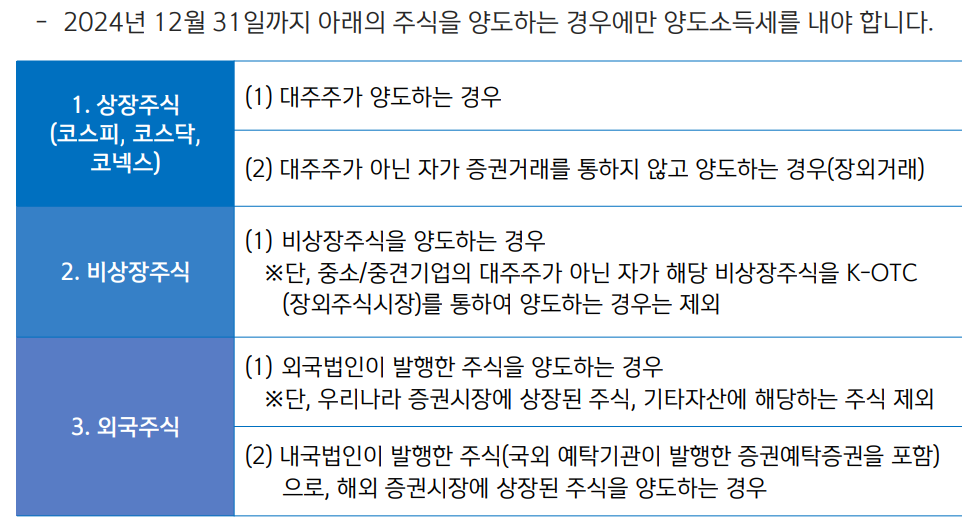 2025년 1월 1일부터는 금융투자소득세로 바뀔 예정이나 2024년 12월 31일까지 적용되는 국내, 외국 주식에 대한 양도소득세율은 아래와 같습니다.