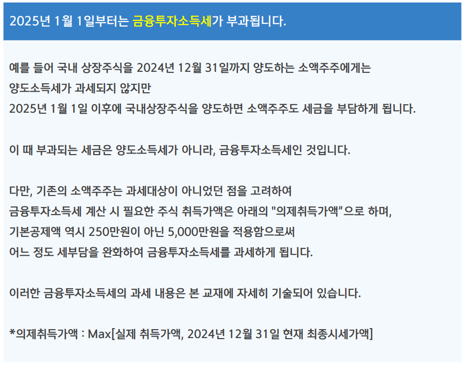 만약 금투세가 적용될 경우 2025년 1월 1일 이후에 국내상장주식을 양도하면 소액주주도 세금을 부담하게 됩니다. 단, 이 때 기본공제액은 250만원이 아닌 5,000만원이며 취득가액이라는 개념으로 계산됩니다.