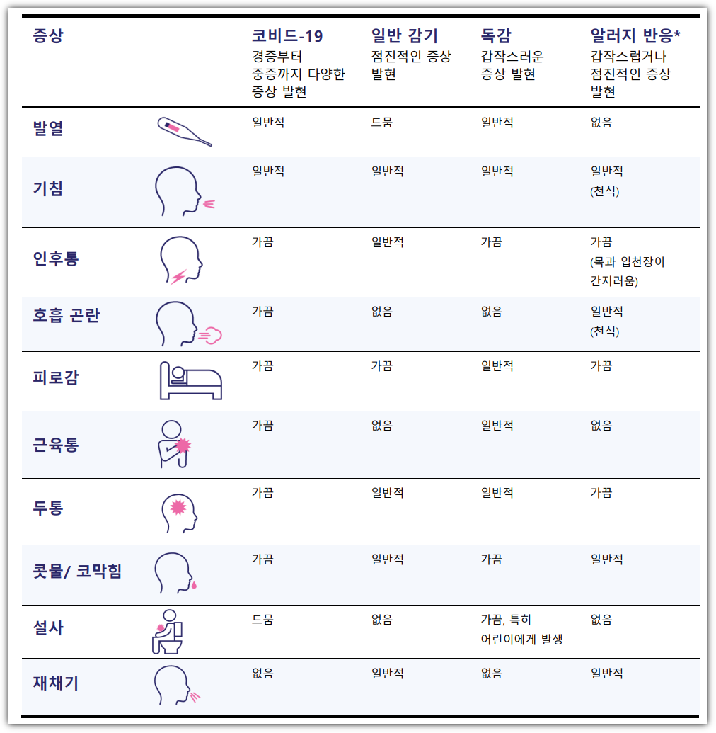 요즘 마스크 착용 의무 해제와 함께 새 학기가 시작되면서 비말을 통해 전파되는 감기 바이러스까지 쉽게 유행할 수 있는 상황입니다. 따라서 코로나 증상과 다른 증상의 차이 먼저 살펴보도록 하겠습니다.