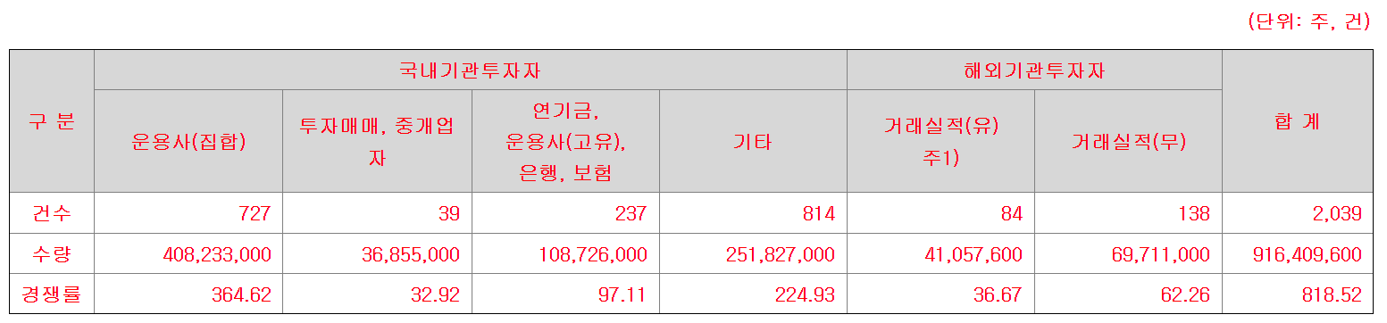 퀄리타스반도체의 수요예측 경쟁률은 818.5대1로 집계됐으며 퀄리타스반도체 수요예측에 참여한 기관들 모두가 희망공모밴드 상단 이상 가격을 제시했습니다. 가격미제시를 제외한 97.8%의 기관이 상단 초과 가격을 제시한 것으로 나타났습니다.